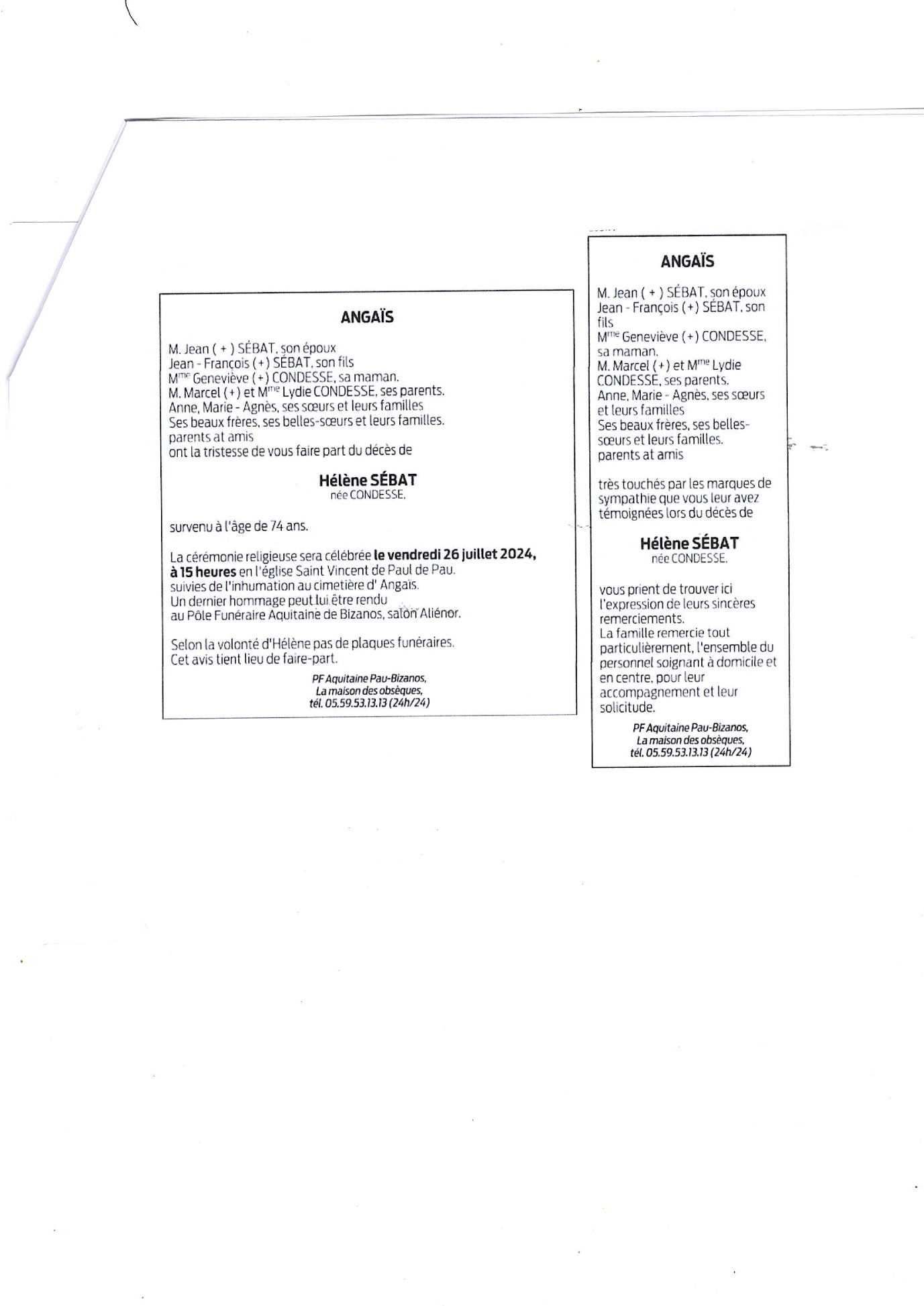 Décédée à Pau (64000, France) le dimanche 21 juillet 2024 à l'âge de 74 ans