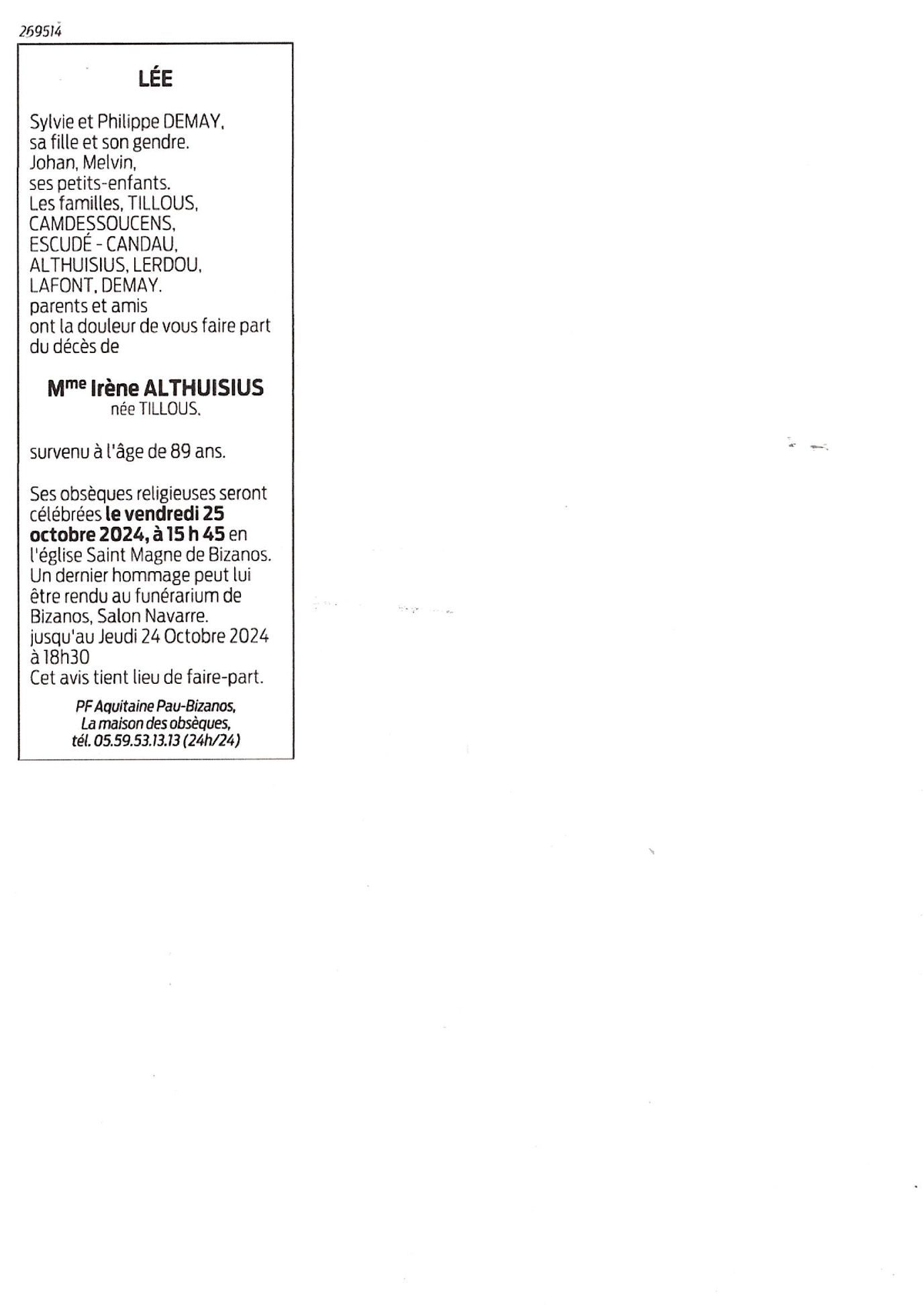 Décédée à Pau (64000, France) le vendredi 18 octobre 2024 à l'âge de 89 ans