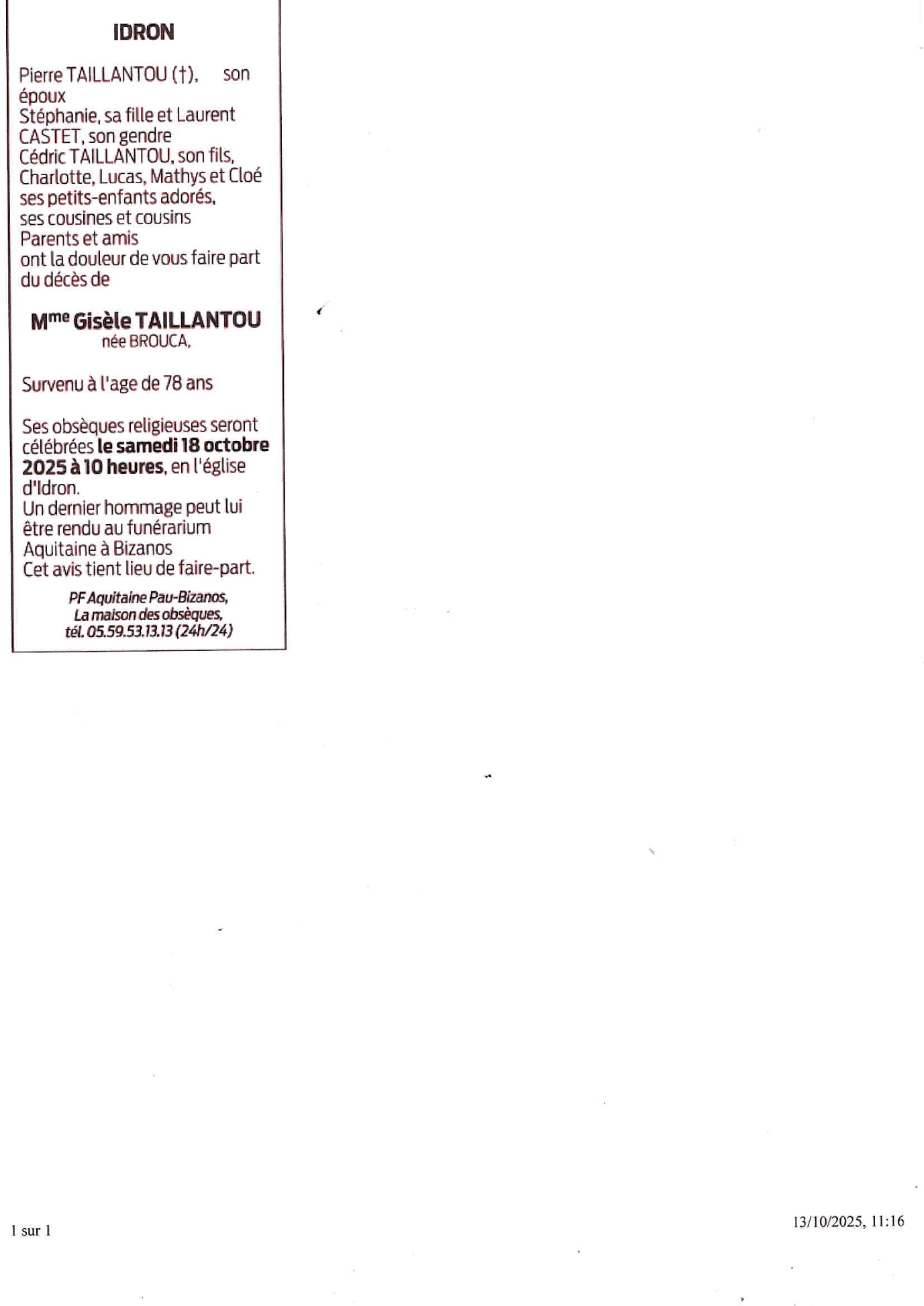 Madame Gisèle TAILLANTOU née BROUCA