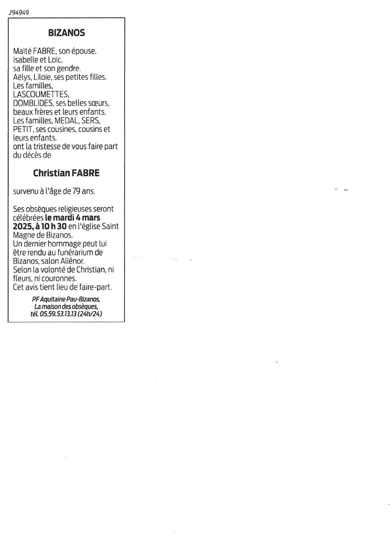 Décédé à Bizanos (64320, France) le mercredi 26 février 2025 à l'âge de 79 ans